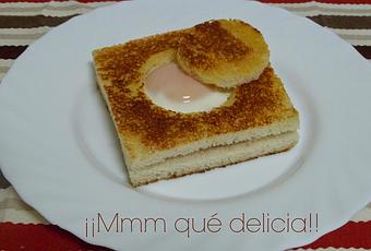 - Sacamos a un plato con el agujero hacia arriba, quitamos esta rebanada, metemos el huevo y colocamos la rebanada arriba pero sin la tapa del agujero, haciendo coincidir este con la yema del huevo. Colocamos la tapa un poco ladeada y ¡¡YA ESTÁ LISTO PARA SABOREAR!!