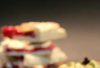 5.- Sobre un cículo de chocolate colocamos una capa de coulis de frambuesa y sobre ésta, la tapa, que podemos haber completado con trozos de pistachos molidos.