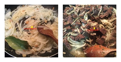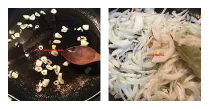 Mientras cortamos las cebollas en juliana y laminamos los ajos, ponemos el aceite en la sartén y cuando este caliente incorporamos los ajos y antes de que se doren agregamos la cebolla y la hoja de laurel.