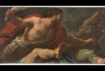 Este lienzo forma parte de una serie en la que se representan diferentes pasajes de la historia de Sansón. Muestra en el centro de la composición al personaje bíblico empuñando como arma una quijada de asno, con la que exterminará a todo un ejército de filisteos (Jueces 15, 14-16). A los lados, los enemigos del pueblo de Dios huyen ante su poderosa acometida.