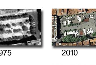 (Ver: En 2001, finalmente, se amplió el aparcamiento haciendo desaparecer casi por completo la vegetación. Un parque sin apenas plantas y sin bancos, pero ya repleto de terrazas y de turistas. Las terrazas de los bares del entorno de la plaza ocupan un espacio público del que se ha desalojado, fundamentalmente, a los vecinos del barrio que hacían uso de él, y que se ha creado a través de la colaboración entre la intervención urbanística y la intervención política desde el Ayuntamiento. Donde antes cualquiera podía sentarse en un banco bajo un árbol, ahora lo debe hacer en la silla de una terraza bajo una sombrilla, pagando.