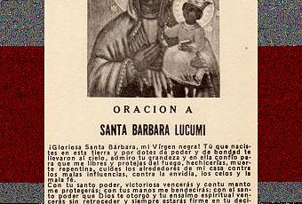El proceso de sincretismo de la religion lucumí (procedente mayormente de Nigeria) con la religión católica es bastante complejo, pero se puede resumir en que fue la forma que hallaron los esclavos de mantener su religión, tomando sus dioses, la forma de los santos católicos. Se habla de imposición, que es verdad, pero se obvia a veces también que estas divinidades no tenían representación alguna en esta religión procedente de África, así que al tomar contacto con otra, aun sin imposición, es bastante comprensible que hubieran tomado las figuras iconográficas que veían. Hoy algunos abogan por representaciones más reales (que ni por asomo es el caso de la estampa) e intentan volver a los orígenes, separando los elementos católicos de los lucumíes, pero son intentos más de índole cultural y con ciertas connotaciones políticas (separarnos de la Iglesia que nos dominó, eliminar un signo de la esclavitud, etc, etc) y no tienen influencia alguna en el pueblo creyente, para el que Shangó sigue siendo Santa Bárbara macho y ya está. Las semejanzas son mínimas y todas de tipo representativo: manto rojo (que llevan diez mil mártires cristianos más, por cierto), el rayo y la tormenta. Y nada más.