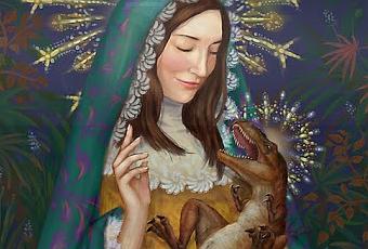 Hiperdulía es el nombre que recibe el culto a la Virgen en el catolicismo. Quiere decir "más que de simple dulía" y se refiere a la veneración a los santos en general por la gracia de Dios presente en ellos. Es decir, la veneración que se profesa hacia objetos o bienes materiales que pertenecieron a ellos (restos óseos, cabellos, vestimentas, utensilios de uso personal...). Y aunque en esta humilde bitácora no somos muy religiosos, no vamos a negar que nos gustaría practicar la hiperdulía si la Virgen hubiese tenido entre sus brazos a un pequeño tiranosaurio como el que aparece en el diseño de camiseta de Mario Lanzas para RedBubble. Puedes conseguir este modelo por unos quince euros aquí y más cosas con este diseño aquí.