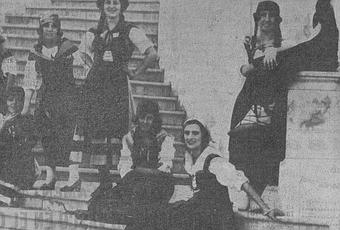 El Hotel Real estuvo soberbiamente adornado. Estas bellas señoritas son como una floración de la Primavera.De izquierda a derecha puede verse a Rosario Burgués, Elena Yllera, Carmen Mazarrasa,Carmen Cabrero,Amparo Burgués, Angeles Cabrero, Mercedes Mazarrasa y Elvira Camino.