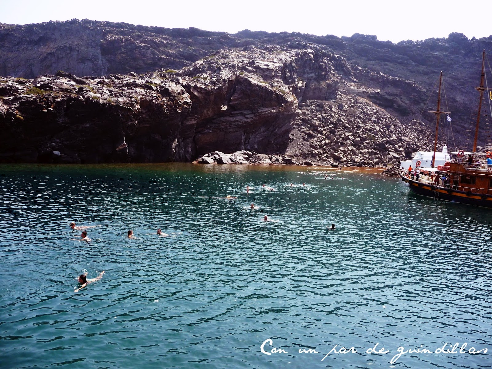 Tras el paseo, volvimos a embarcar, pero no para volver, sino para ir hacia otro lugar de la isla dónde poder bañarnos en aguas 'termales y marinas'. Me explico, hay una zona en la que bajo el agua, el calor de las emanaciones volcánicas hace que ésta esté aún más caliente y de un peculiar color rojizo.