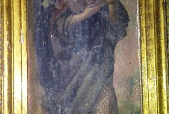 P: Pintura 1: detrás de la mujer parece que hay una roca.R: Representa a una penitente, si te fijas, el vestido es de tejido de arpillera, o sea, muy áspero, resaltar la penitencia. Lo que indicas como una roca, lo es, y es más, es una cueva, puede verse la oquedad de la "entrada". Así que es fácil identificarla: Es Santa María Magdalena (22 de julio, 20 de marzo, traslación de las reliquias, y Tercer domingo de Pascua, de las Miróforas), a quien la tradición devocional hace una prostituta arrepentida, y la leyenda provenzal hace penitente, retirada en una cueva, la "sainte Baume" en Marsella, Francia. La profunda mirada en el crucifijo nos evoca un alma contemplativa, como también refiere la devoción y el culto multisecular a esta santa.