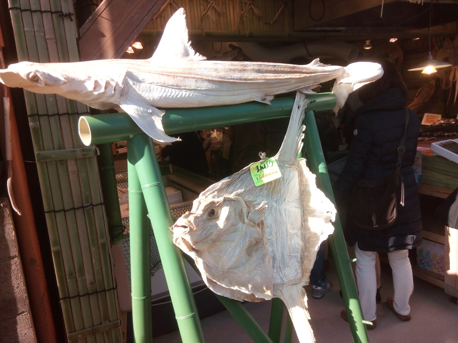 魚屋の店内には干物がたくさん。マンボウやサメ等、びっくり仰天の干物まで飾られており、見ているだけで楽しめました。En una pescaderia encontré los pescados resecados.