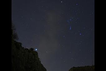 Sirio y Orión sobre los cortes de una cantera abandonadaHace unos pocos días hablaba en este blog de Saturno, el planeta gigante que parecía seguirme por las noches. Pero entre los astros y constelaciones que podemos ver durante el invierno en el hemisferio norte, la protagonista indiscutible es Orión, que destaca en la noche por su gran tamaño y por su forma característica.