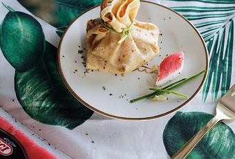 - Añadir una cuchara de la mezcla en el centro del crepe. formar un saquito con la crepe y cerrar con una ramita de cebollino fresco .