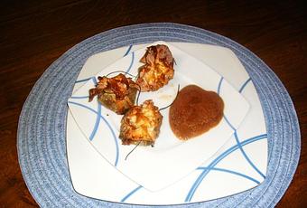Ponemos un poco de rabo de toro deshuesado encima de tres hojas de pasta filo, los atamos con cebollino, los saquitos.