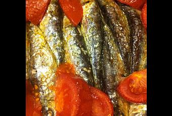 Ponemos las sardinas con la piel hacia arriba o enteras dependiendo de la medida de las sardinas y las pintamos con el aceite de ajo y unas rodajas de tomate . No tiene que haber mucho aceite en la bandeja porque sino se cocerán .