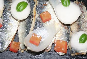 SARDINAS EN ACEITE CON CEBOLLETA ASADA Y ESPUMA DE AGUA DE TOMATE