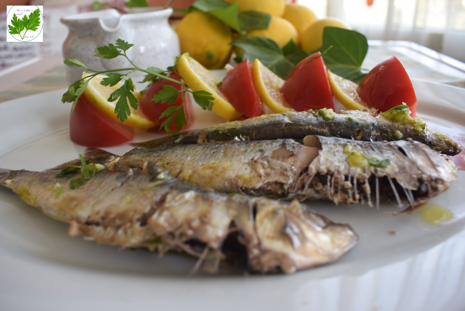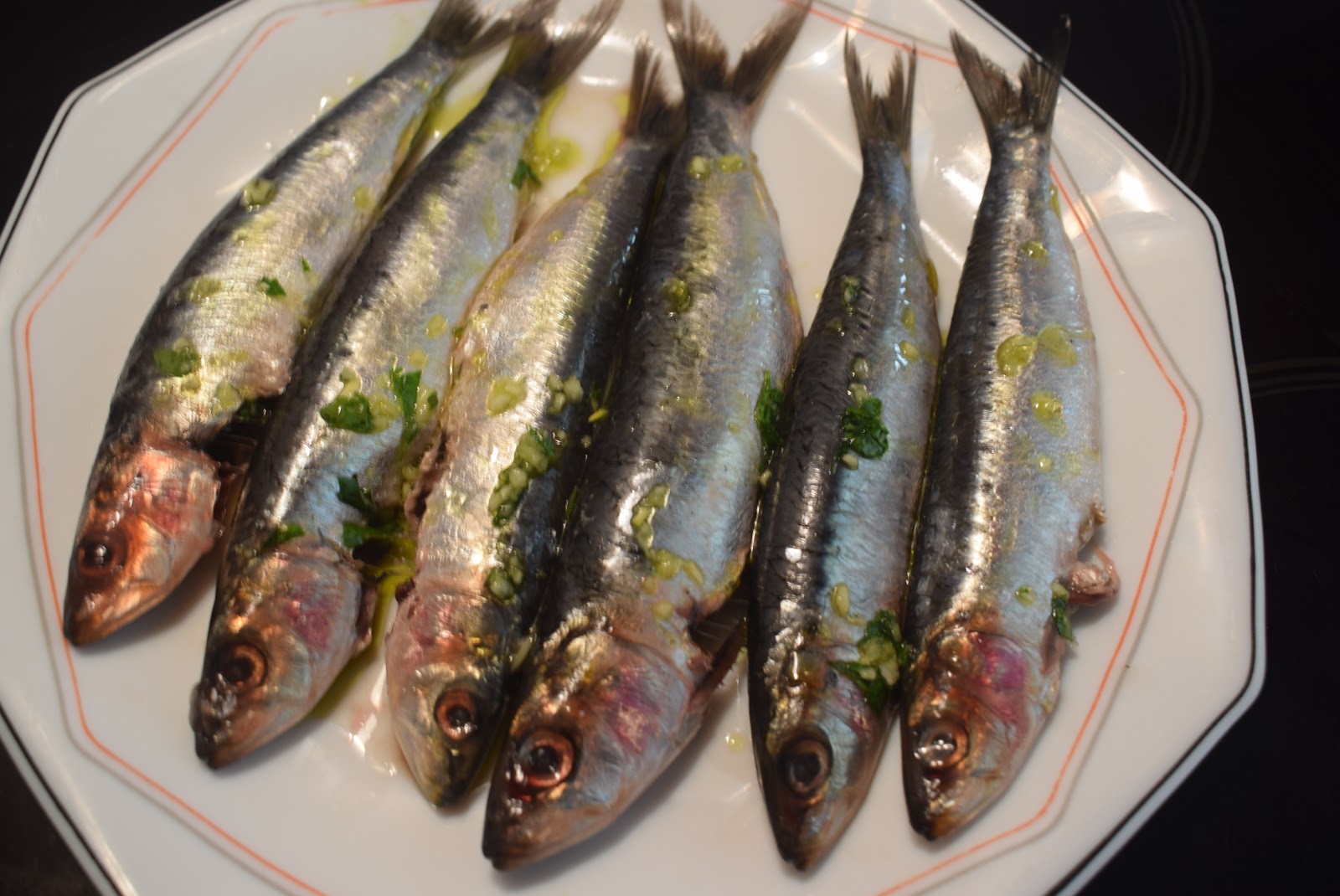 Prepara con antelación el aceite con ajo y perejil. Para ello pon en una salsera el perejil picado, los dientes de ajo muy picaditos y cubre de AOVE. Reserva.Limpia las sardinas quitando las escamas y vísceras. No quito la cabeza ( si quieres puedes quitarla). Pon las sardinas en un plato, unas 6 sardinas. Rocía por encima con unas cacharaditas de la picada de aceite,ajo y perejil.