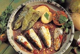 Se cortan las patatas en rodajas y se ponen en una fuente. Poner las sardinas sobre ellas.