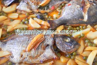 Colocamos el pescado encima de las verduras, colocamos las patatas en la parte de la fuente que no este´ocupada por los sargos. Sazonamos y ponemos la hoja de laurel una ramita de perejil y los guisantes.