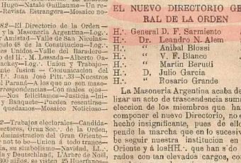 Clicar en la foto para ampliar Noticia de la elección del General Domingo Faustino Sarmiento como Gran Maestro de la Masonería Argentina de la época. Como Pro Gran Maestro fue elegido el Dr. Leandro N. Alem, fundador del Partido Radical. Después de un año, este último ocupó la Gran Maestría, completando el período que le hubiera correspondido terminar a Sarmiento.