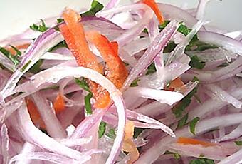 Preparación: Primero cortar las cebollas (corte pluma), luego lavar con abundante agua y un poco de sal, escurrir y reservar. Poner en un recipiente, incorporar el zumo de limón, sal y pimienta al gusto. Mezclar bien.