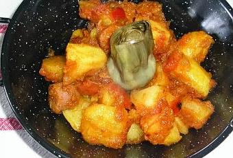 Ingredientes:2 cebollas1 pimiento rojo1 pimiento verde5 tomatessalaciete8 patatas8 salchichas1 vasito de vino blanco