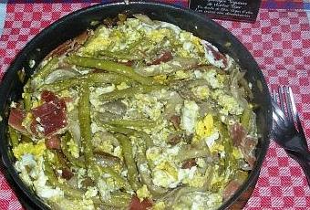 Ingredientes:1/2 bote de espárragos verdes Huertor tajar5 huevos4 lonchas de jamón serrano6 setas de cardo grandes2 dietes de ajoAOVEsalpimienta