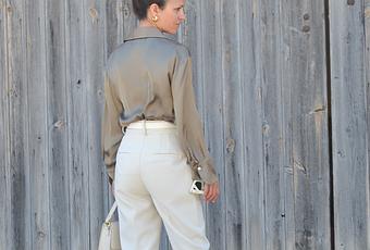 Hola mis bloggers, ¿qué tal estáis?, hoy os traigo este look que me encanta y es que los look formales tienen eso que nunca defraudan y más si le añades prendas básicas pero con ese toque más formal.La combinación de estos colores me chiflan, ya que la camisa es divina, aunque debo de reconocer que se me manchó nada más ponerla con el desodorante y hasta que no va a la lavadora no se va... Pero bueno, es lo que tiene el tejido satinado. A pesar de este percance, el tejido es holgado, fresquito y muy versátil. Yo la combiné con estos pantalones de vestir en blanco roto al que le quité su cinturón original y le añadí este de piel del mismo tono así rompía un poco.Si a ello le añades unos salones joya el resultado se multiplica. En tonos blanco roto las gafas y el bolso y los complementos en dorado nunca deben fallar.Os dejo con las fotos: