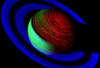 Aunque Saturno contiene comparativamente poca cantidad del elemento neón, esta composición en falso color en tres bandas de luz infrarroja pone de manifiesto varias características del planeta gigante anillado como si fuera un letrero luminoso. En el lado más azul de la luz infrarroja - el falso color azul de la imagen - Saturno propiamente dicho aparece oscuro, pero los delgados anillos de Saturno reflejan intensamente luz del Sol. Por el contrario, el anillo B de Saturno es tan grueso que hay poca luz reflejada que lo atraviese, lo que crea una banda oscura entre los anillos A y C. En el lado más rojo del infrarrojo - el falso color rojo de la imagen - Saturno emite un resplandor térmico sorprendentemente detallado que muestra bandas que cubren todo el planeta, enormes tormentas huracanadas y un extraño sistema de nubes en forma de hexágono alrededor del polo Norte. En la banda del infrarrojo medio - el falso color verde - el lado iluminado de la atmósfera de Saturno refleja la luz y brilla. La imagen fue obtenida en 2007 por la sonda Cassini que orbita Saturno a unos 1,6 millones kilómetros de distancia.