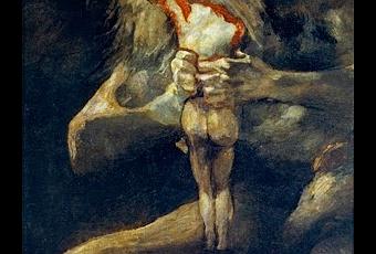 Goya (1746-1828)Saturno devorando a un hijo, 1820Óleo sobre lienzo - 143 x 81 cmMuseo del Prado, MadridEsta obra es una de las imágenes más impactantes y sobrecogedoras de la historia del arte, así como de la propia producción de Goya. El tema tiene su origen en el relato mitológico del dios Saturno devorando a uno de sus hijos. La referencia literaria, sin embargo, se convierte en una horrible pesadilla: un monstruo terrible y gigantesco se dispone a devorar los despojos del cuerpo de su hijo. El monstruo hace uso de su fuerza para acabar con los restos de un cuerpo ensagrentado y segmentado. Lo terrible de esta imagen es la gran impotencia que se siente, pues luchar contra un monstruo de tales dimensiones es una lucha perdida.