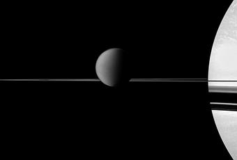 Otra maravillosa vista de Saturno, sus lunas y sus anillos a cargo de la cámara de ángulo estrecho con luz visible a bordo de la sonda Cassini realizada el pasado 15 de enero. Podemos ver en la parte izquierda de la imagen al satélite Titán, de 5150 km de diámetro, a la derecha la pequeña luna Encélado, de 504 km, el plano de los anillos a la altura de la Cassini y una parte del enorme Saturno, unos 115.000 km de diámetro – poco menos que un tercio de la distancia Tierra-Luna y unas diez veces el tamaño de nuestro planeta -, con la sombra de los anillos visibles en el hemisferio sur. Foto: CICLOPS. Clic para ampliar.