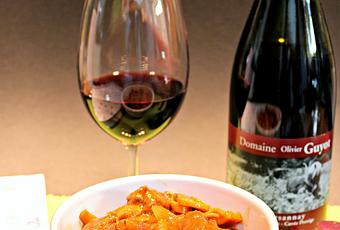 En cuanto al vino, la propia Julia recomienda un rosado (no deja de ser un plato de influencia provenzal y ya sabemos lo típicos que son allí los rosados) o un blanco con barrica. Yo lo serví con un Borgoña asequible, un vino que compro de vez en cuando y es de trago fácil, muy amable. Yo te propongo este plato con un tinto joven, no hace falta que sea un pinot noir, aunque le va muy bien.