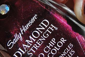 Un color que compré hace poco de la línea de Sally Hansen, Diamond Strength es el Save the Date, un color borgoña con shimmer azul violáceos, rojos y plateados. Después del chasco con la línea Hard as nails, prefiero gastar un poco más y no llevarme sorpresas (aunque el negro de esta colección si es un chasco: se necesitan varias capas para lograr el color del frasco).