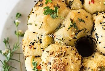 - Mezclar todos los ingredientes del baño de mantequilla: (mantequilla, ajo y queso). Pasar cada bolita por el baño de mantequilla fundida e inmediatamente hacer rodar cada una sobre el topping elegido. Depositar las bolitas de masa en un molde de tubo central de 20 cm de diámetro ligeramente aceitado.