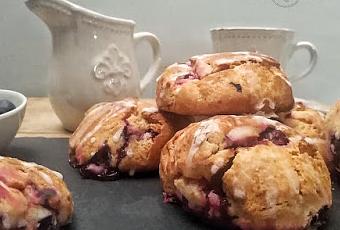 1.- En un bol tamizamos la harina, el azúcar, la levadura, la sal y añadimos 1 cucharada de ralladura de limón. Lo mezclamos todo muy bien con los dedos.2.- Después añadimos la mantequilla y amasamos con las manos (primero vamos pellizcando con los dedos la mantequilla hasta que notamos todo arenoso y a continuación continuamos amasando con las palmas de la mano haciendo que la mantequilla se vaya formando en láminas).3.- Cogemos otro bol y ponemos la nata, la leche, el huevo y la vainilla y batimos. Una vez batido, añadimos de golpe a la masa.4.- Amasamos un poco con una espátula. Espolvoreamos la encimera con harina y continuamos amasando con las manos.5.- Aplanamos la masa y la vamos doblando para crear capas. Agregamos arándanos, volvemos a doblar la masa y añadimos más arándanos. Amasamos hasta conseguir un grosor de 4 cm. Formamos un círculo con la masa y cortamos 8 scones en forma de triángulos.6.- Colocamos los scones en una bandeja y los untamos con leche por encima para que brillen.7.- Horneamos durante 20 - 25 minutos a 190º