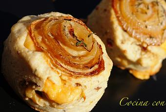 Añadimos los dados de queso y el bacon cortado en trocitos pequeños a la masa que tenemos preparada y la amasamos un poco para que se integren los ingredientes, estiramos con un rodillo en una mesa con harina y cortamos circulos de unos 4 cm. de diámetro ayudándonos de un vasito o de un cortapastas, los ponemos sobre una bandeja de horno con papel de cocina, los pintamos con un poco de leche y colocamos los aros de cebolla encima, espolvoreamos con tomillo y los horneamos a 180º unos 20 minutos.