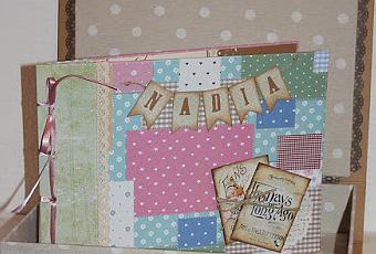 El mes pasado, M: se puso en contacto conmigo desde Asturias. Quería un álbum con caja a juego para Nadia, recién llegada.Eligió la encuadernación japonesa en formato grande:10 hojas tamaño folio, algunas plegadas, todas ellas troqueladas en los bordes formando una puntilla preciosa, desplegables, tarjetas en cascada, papeles de sire infantil pero huyendo de lo típico. Tags de aire retro, palabras en madera.....Y un papel de juguetes antiguos que me tiene enamorada.Además, le preparé a juego la caja donde guardarlo, rematada en las esquinas con estas cantoneras tan bonitas que usamos en los talleres de cajas libro.El conjunto quedó fantástico.No fue su único encargo, los reyes magos visitaron las casas de sus hermanos con mas regalos de scrapbooking.Hasta dentro de unos días.