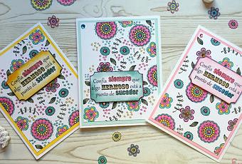 ¡Muy buenos días!Quienes me conocéis y me seguís ya sabéis lo que me gustan las flores... Pues bien, en cuanto vi este kit de sellos de la marca Aladine no me pude resistir a comprarlo. En realidad es un cubo de plástico repleto de sellos de caucho, con florecitas y hojas, la verdad es que es una auténtica monada ;-) Y por cierto bastante económico, pues van 34 y cuestan alrededor de 10 euros. A mi desde luego me parece toda una ganga ¡y que conste que no me llevo comisión! ;-) Simplemente es que me encantan y quería compartirlos contigo.Bien, pues dicho todo esto, estas son las tres tarjetas que he elaborado con ellos: Y si quieres ver el paso a paso aquí tienes el vídeo: