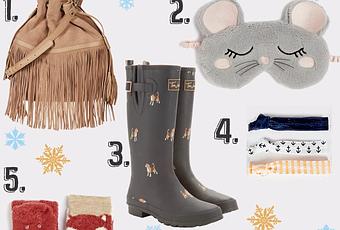 1. TOPSHOP Suede Tassel Duffle Bag | 2. OYSHO Sleeping Mask | 3. Joules Wellies | 4. Urban Outfitters Anchor and Stripe Hair Bands | 5. OYSHO Fluffy Fox Socks | 6. OYSHO Slippers
