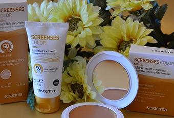 Descripción de los productos:La gama “Screenses Color” de SESDERMA nos ofrece fotoprotectores con color para el uso diario, aptos para todo tipo de pieles. Están formulados con una avanzada combinación de filtros solares que aseguran un factor de protección muy alto (SPF50) y ayudan a prevenir los signos de fotoenvejecimiento (arrugas y manchas). Además, los productos de esta gama corrigen y difuminan las imperfecciones gracias a su poder cubriente, proporcionando un acabado natural, aterciopelado y sin brillos.“Screenses Color” cubre los espectros de radiación UVA, UVB, UVC e infrarrojos gracias a la combinación de filtros químicos y físicos con pantallas minerales. El ratio entre protección UVA/UVB es menor de 0,50 lo cual permite una exposición prolongada al sol, todo lo contrario de lo que sucede con otros productos cosméticos que tienen un índice UVB alto y un índice UVA bajo. Está indicado para todo tipo de pieles, especialmente para aquellas que se exponen diariamente al sol y que presentan imperfecciones. Los productos pueden utilizarse tras procedimientos médicos, tales como intervenciones quirúrgicas, peelings químicos o con láser, microdermoabrasiones. El Fotoprotector Fluido “Screenses Color SPF 50” es un protector solar con color para el uso diario, indicado para pieles secas. Su textura fluida de cremigel es suave, fácil de aplicar y de rápida absorción. Es ideal para obtener un tono uniforme. Además, cubre imperfecciones y se funde con el tono natural de la piel.