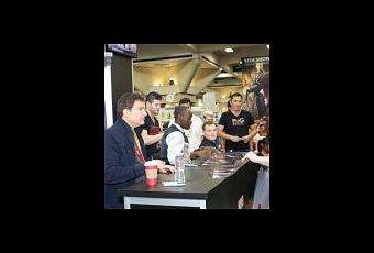 Antes de que los niños disfrazados saliesen al estrado, el director de Iron Man 3 Shane Black y el actor Don Cheadle (Rhodey / Máquina de Guerra), estuvieron firmando autógrafos a los asistentes frente a la sala de armaduras que Marvel montó en el recinto.