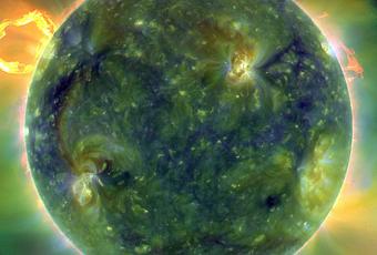 El Observatorio de Dinámica Solar, o SDO por sus siglas en inglés, que fue lanzado recientemente por la NASA ha enviado imágenes para confirmar una nueva capacidad sin precedentes para que los científicos comprendan mejor los procesos dinámicos de nuestro Sol, los cuales afectan a todo en la Tierra.Izquierda: Imagen de multilongitud de ondas del ultravioleta extremo del disco completo del Sol tomada por SDO el 30 de marzo de 2010. Los colores falsos marcan las diferentes temperaturas de gases. Los colores rojizos son relativamente fríos (cerca de 60.000 Kelvin, o 5.975ºC); los colores azules y verdes son más calientes (superiores a 1 millón de Kelvin o 10.000ºC). Crédito: NASA/Goddard/Equipo SDO AIA.