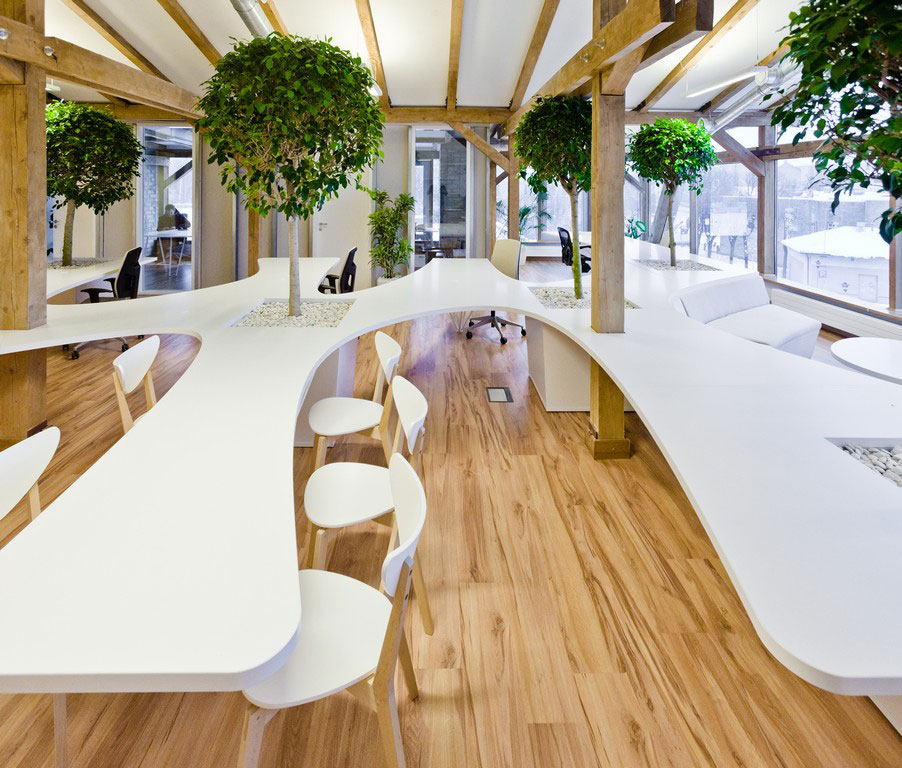 Algo tipico de una oficina era encontrarte algún que otro cactus encima de las mesas para evitar que las radiaciones emitidas por los ordenadores dañaran a la persona que los utilizaba, entre otros motivos. En este diseño, de Open AD, han ido más allá y han decidido incorporar árboles en la mesa. No se que se conseguirá con ello, pero el ambiente es totalmente diferente. Ahora me pregunto yo, con tanto árbol, una vez que no haya luz y la fotosíntesis siga su curso ¿ qué se hace con el monóxido de carbono ( CO2), emitido por la noche? Vía: Contemporist