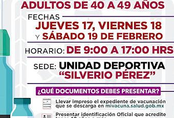 Del 17 al 18 de febrero del 2022, se aplicarán las vacunas de refuerzo para adultos de 40 a 49 y de 30 a 39 años, así como las dosis de refuerzo, en el Deportivo Silverio Pérez, única sede de vacunación en Texcoco.