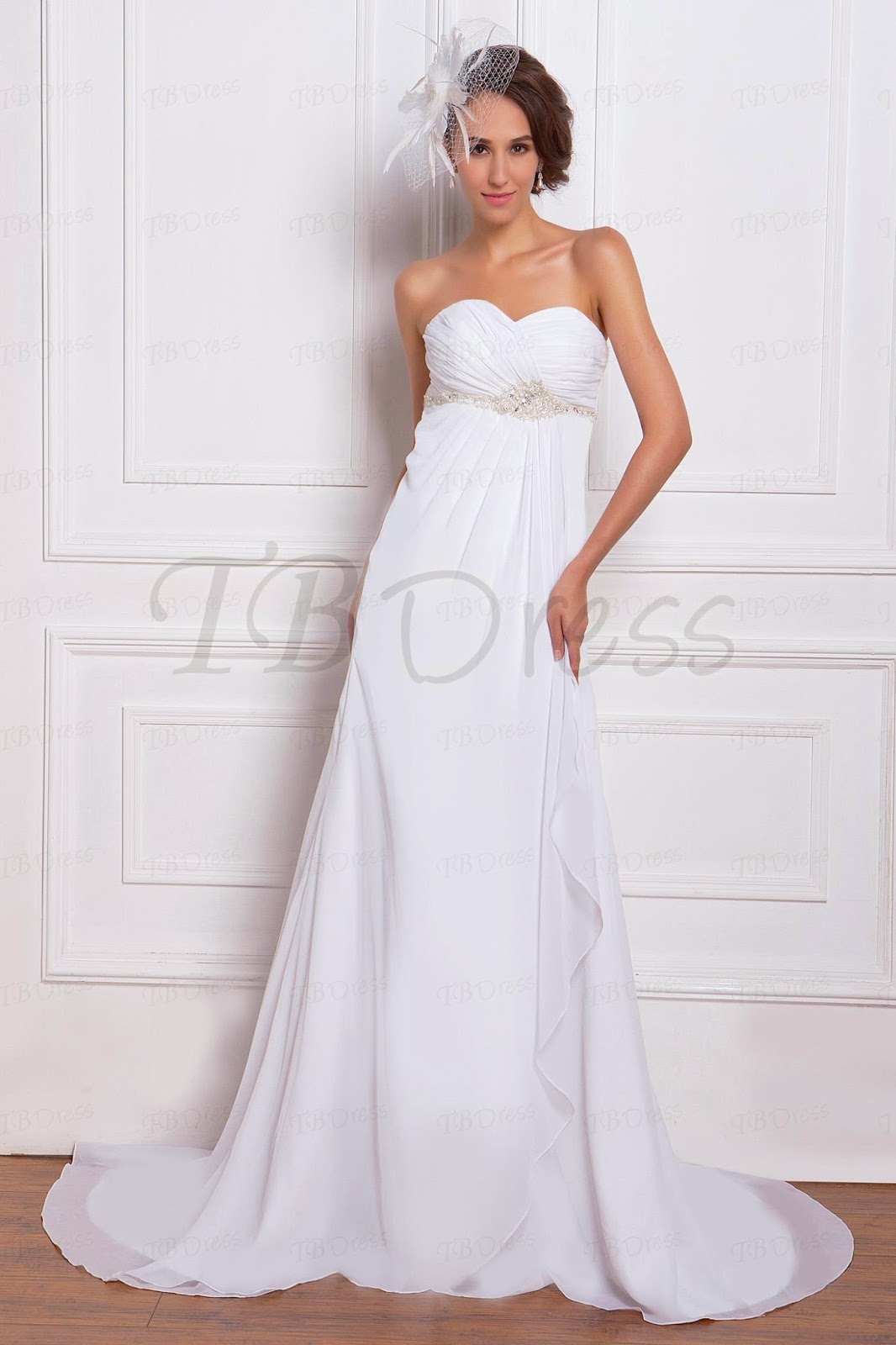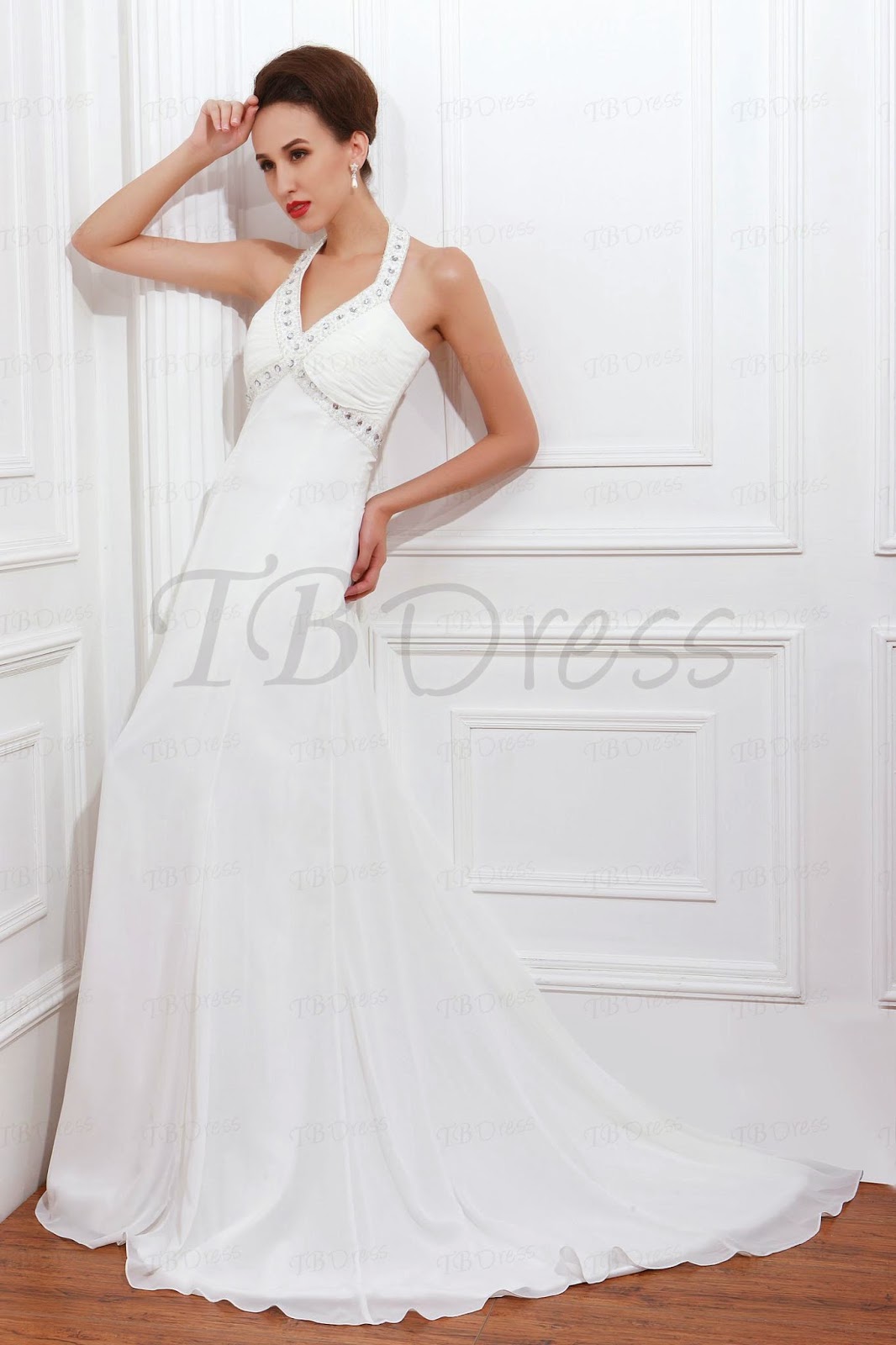 El primero es un vestido precioso y muy vaporoso. Destaca por su escote con forma de "V" con pedrería que se ata al cuello. http://www.tbdress.com/product/Fashion-Sheath-Column-Halter-Chapel-Train-Beaded-Renatas-Wedding-Dress-9647061.html Maternity Wedding Dress
