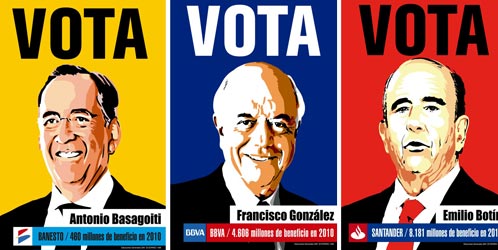 También de este lado de la barrera “Izquierda Anticapitalista” anima a los votantes a dejar de obedecer a todos los “poderosos”. La formación –que concurre en coalición con otros partidos con el nombre de Anticapitalistas– presenta unos carteles de su campaña que nada tienen que ver con los de siempre. En ellos se puede ver al presidente del Banco Santander, Emilio Botín, y, sobre su figura, el consejo: “Des-obedece”. Otra entrega incorpora imágenes del rey o de los candidatos de PSOE y PP para la Presidencia del Gobierno, Rubalcaba y Rajoy, respectivamente. Dichos carteles están divididos por temas, según explica Raúl Camargo, portavoz de la formación: “Representan a personajes a los que queremos desobedecer, cada uno en su ámbito. El partido ha escogido a la canciller alemana, Ángela Merkel, para el tema de la deuda, a Botín, para la banca, al presidente de la Patronal, Joan Rosell, para expresar su queja sobre el paro, o a Florentino Pérez, para denunciar la crisis ecológica, por su constructora-depredadora ACS”…