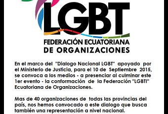 En el marco del Diálogo por la Equidad y la Justicia Social que impulsa el gobierno de Ecuador, el pasado viernes 10 de septiembre de 2015 se registró la histórica conformación de la Federación Ecuatoriana de Organizaciones GLBT (Gays Lesbianas, Bisexuales y Transgéneros), la misma que acoge a casi 2 mil miembros de esta comunidad, aglutinados en 60 colectivos provenientes de todo el territorio ecuatoriano.