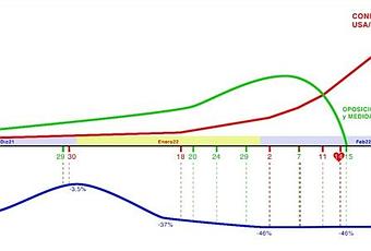 Fruto de esta investigación sobre qué provoca las decisiones, entre ellas las de consumo, se elaboró la teoría de la Curva de Vida de Las líneas de pensamiento, que son las que modulan las decisiones de compra que se ve con el iTB. En la gráfica de abajo se ve la Curva de la Vida de dos líneas de pensamiento distintas pero muy interrelacionadas, de la que se deduce y explica el porqué de la caída del consumo en las últimas quincenas: la Curva de Vida de la línea de pensamiento en “contra de las vacunas Usa y las medidas de Occidente contra el Covid”, y por otro la Curva de Vida de la línea de pensamiento de la “Confrontación USA/Rusia en Ucrania”.
