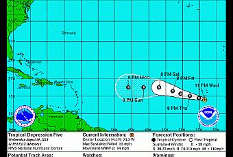 Se formó este miércoles la depresión tropical N. 5, distante a 130 kilómetros de las Islas Cabo Verde, con vientos máximos de 55 kilómetros por hora.