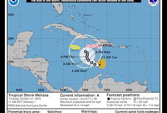 Se espera que en las próximas horas Melissa disminuya su velocidad de traslación y que al mismo tiempo sus vientos se fortalezcan de manera gradual y se convierta en huracán.
