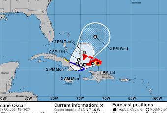 A las 8 de la noche de este sábado, el huracán Oscar tenía vientos de 140 kilómetros por hora, en la latitud norte 21.3 y en la longitud oeste 71.6, en traslación oeste a 17 kilómetros por hora o 10 millas por hora.