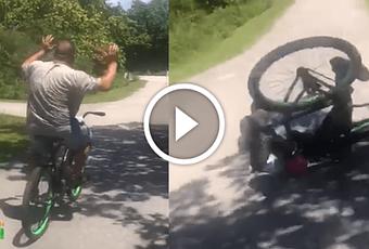 El joven haciendo maniobras mientras andaba en su bicicleta de momento levantó las manos y quedó captada en el video la fuerte caída que se dió.
