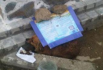 Nos dieron el aviso de un perrito que estaba sin moverse y al que parece ser "alguien" le había puesto una especie de cartón con piedras para refugiarlo de la lluvia, y se ve que no han sido muy listos pues le han puesto comida con arroz al lado de su cabeza!!! lo que ha atraído a las hormigas más grandes que había!!!, estaba todo su cuerpecito lleno de hormigas!, y el pobre no se movía, ni se quejaba.
