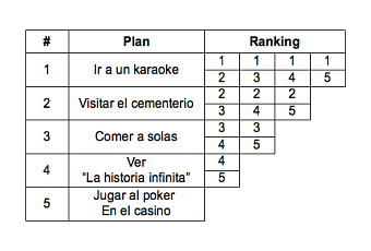 Con la misma lógica ahora voy a ir marcando mis preferencias, siempre comparando una actividad con la otra. Se puede observar que en el segundo paso ya no tendré que comparar nada con la opción del karaoke, porque esto ya lo he hecho. Así que al final del ejercicio, la plantilla quedó de la siguiente manera: